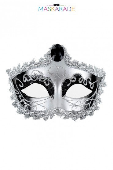 Loup argenté et brillant, avec bijou sur le front et bordure dentelle, pour se cacher tout en se montrant, par Maskarade.