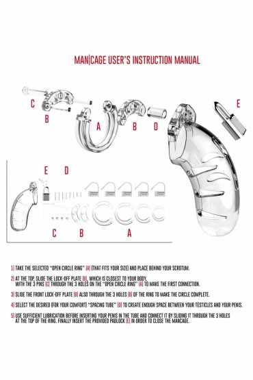 Afin de préserver une hygiène irréprochable au porteur de la cage, celle-ci est équipée de trous d'aération et d'une ouverture à son extrémité permettant d'uriner sans la quitter.