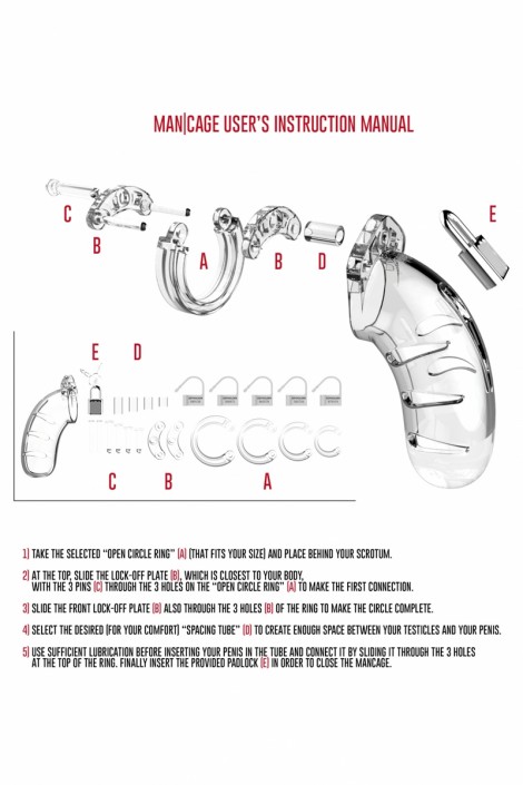 Accessoire de contrainte par excellence, la cage peut se verrouiller à l'aide d'un cadenas en métal (1 fourni) ou d'un cadenas en plastique jetable (5 fournis). L'utilisation de cadenas en plastique vous garantit de ne pas déclencher l'alarme des détecteurs de métaux lorsque vous passez sous un portique de sécurité dans un aéroport par exemple.