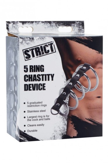 Le "Five Gates of Hell" se compose d'une série d'anneaux en acier inoxydable reliés par une courroie en cuir avec à son extrémité un anneau de fixation de type D ring. Le plus grand des 5 anneaux se place derrière les testicules et la verge. Il permet de maintenir le dispositif en place tandis que la verge entre dans les 4 autres anneaux pour y rester enfermée.