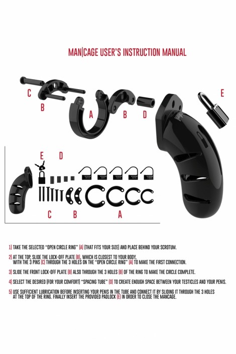 Accessoire de contrainte par excellence, la cage peut se verrouiller à l'aide d'un cadenas en métal (1 fourni) ou d'un cadenas en plastique jetable (5 fournis). L'utilisation de cadenas en plastique vous garantit de ne pas déclencher l'alarme des détecteurs de métaux lorsque vous passez sous un portique de sécurité dans un aéroport par exemple.