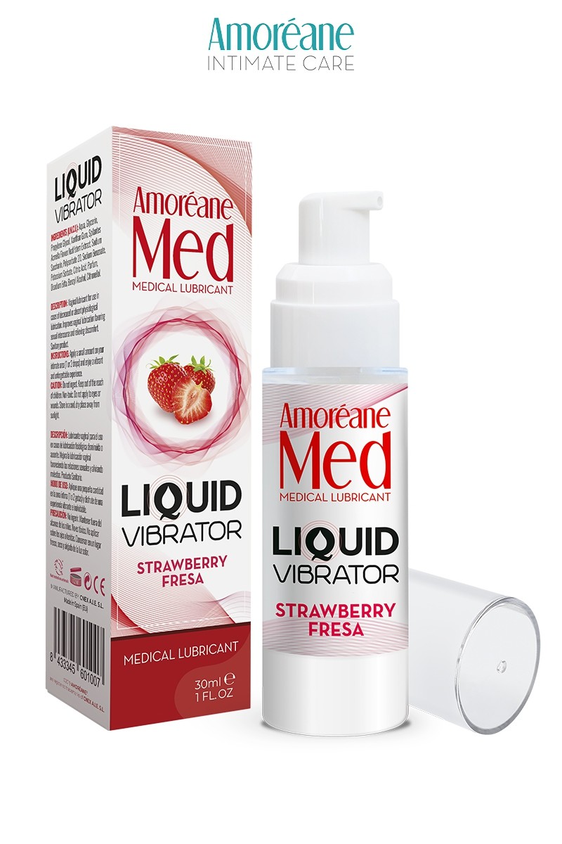 Liquid Vibrator Fraise, fabriqué par Amoréane Med est un lubrifiant intime médical à base d'eau parfumé à la fraise avec effet vibrant.